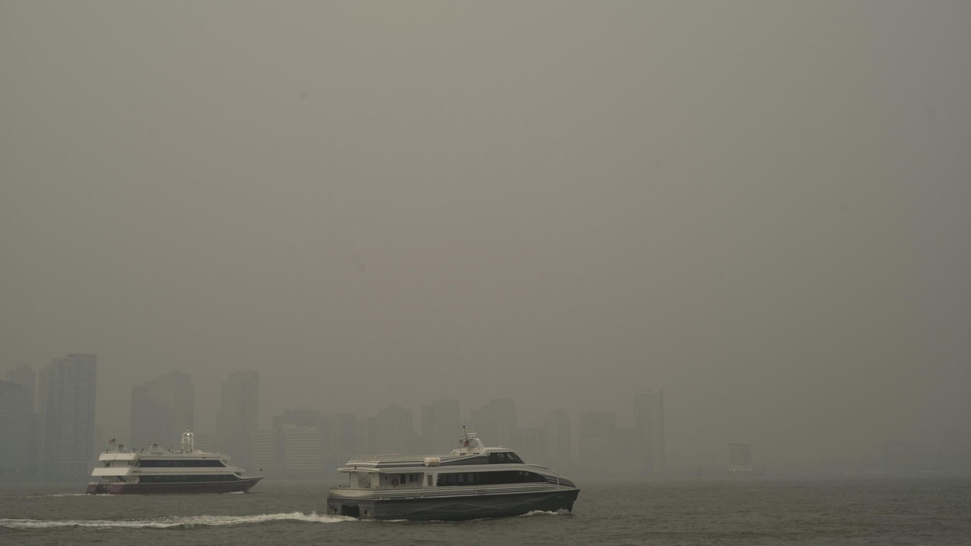 Здания в Джерси-Сити частично скрытые дымом от лесных пожаров в Канаде